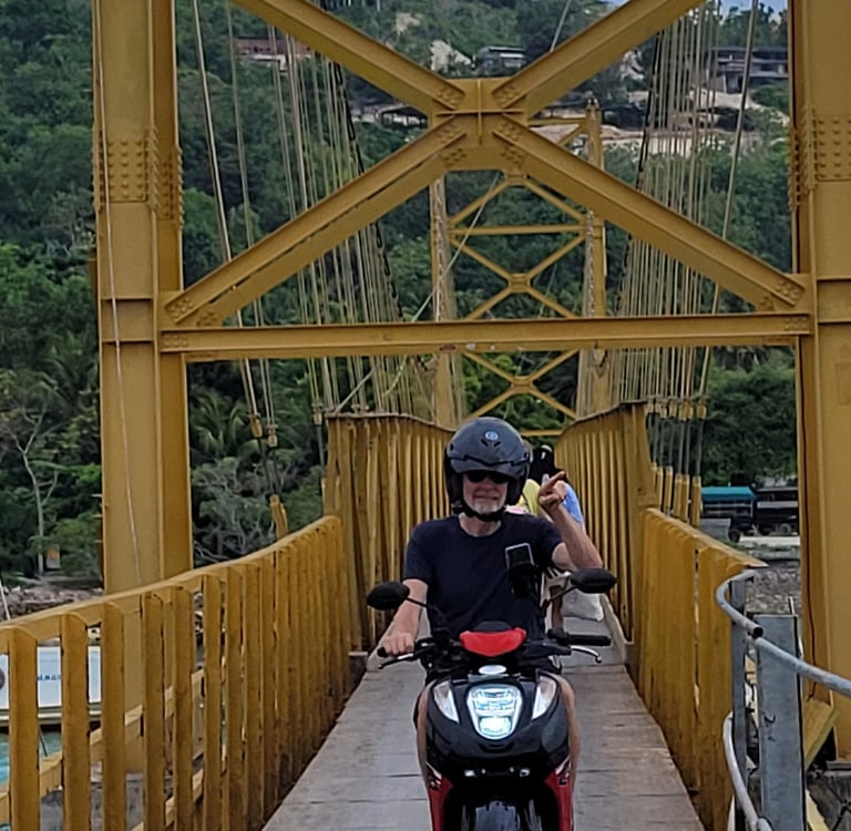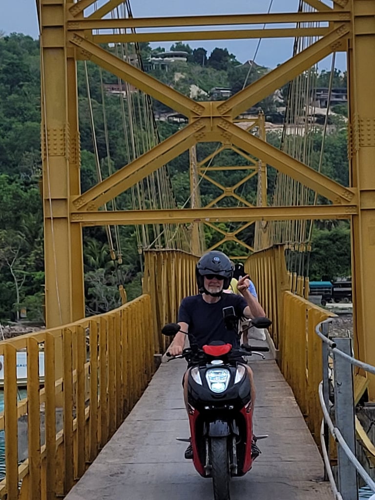 Mit einem Motorroller erkunden wir Nusa Lembongan und die Schwesterinsel Nusa Ceningan, die über eine schmale gelbe Hängebrücke verbunden sind. Zwei Motorroller passen gerade nebeneinander auf die Brücke. Wenn ein Roller allerdings Gas- oder Wasserflaschen geladen hat, dann hangelt man sich vorsichtig aneinander vorbei. Wir sehen Surfern beim Wellenreiten zu, besuchen die unspektakuläre blaue Bucht. Zurück auf Lembongan erkunden wir den Strand, der nicht so schön ist, wie der Mushroom bay nahe bei unserer Unterkunft. Mit dem Scooter gehen wir dem Tipp von Paula, der Besitzerin unserer Unterkunft nach: Kaffee trinken im Tales bookcafé; es wirkt ein wenig schwedisch angehaucht. Schwedischer Erdbeerkuchen und Köttbullar, die berühmten Hackbällchen, stehen auf der Speisekarte. Und zu Ruths Freude servieren sie neben Käsekuchen auch entkoffeinierten Cappuccino. Seit acht Wochen vermisst sie diesen. Das Interieur besteht aus gefüllten Bücherregalen. Die Raumdecke verzieren einzelne Buchseiten und Bücherlampen.