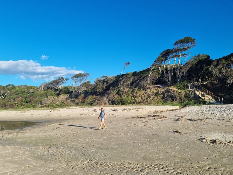 Über den Highway M1 fahren wir 250 km zum Hat Head Nationalpark. Die Straße verläuft durch Farmland, aber vorallem durch viele Eukalyptuswälder. Auf der Autobahn ist wenig Verkehr; erst als wir Coffs Harbour erreichen, stehen wir im Stau.