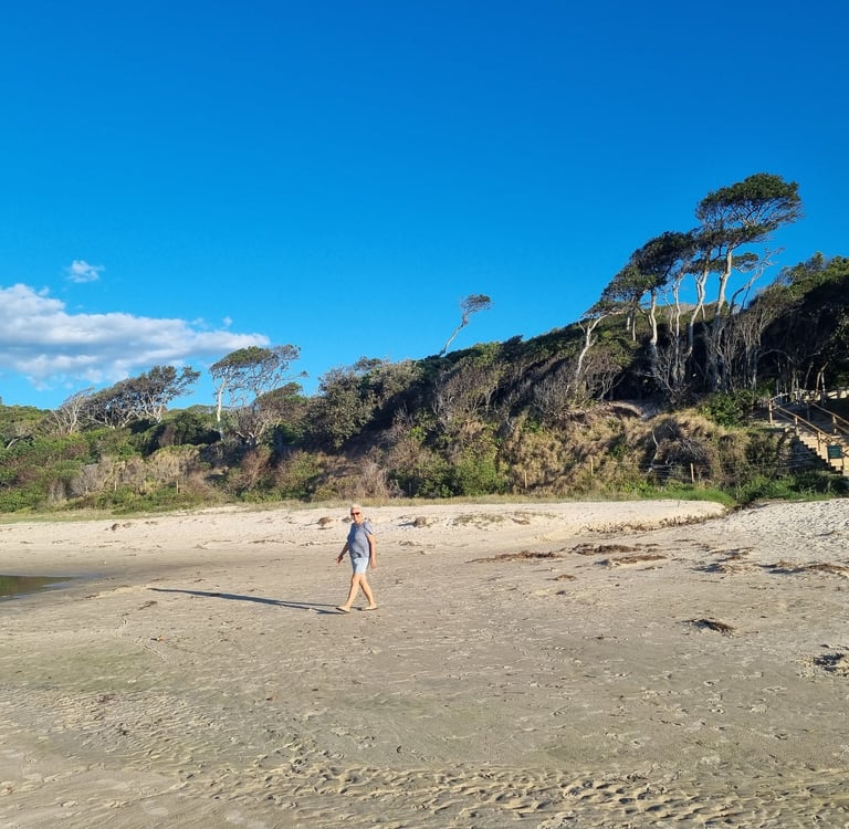 Bayron Bay galt früher als Hippie- und Surfhochburg. Surfer gibt es viele, die Hippies wurden zwischenzeitlich durch gesetzteres, zahlungskräftigeres Publikum ersetzt. Der Ort hat Charme. Unser Campingplatz liegt am Ostende der großen sichelförmigen Bucht. Bemerkenswert ist, dass es keinen Hafen gibt und ganz selten sehen wir ein Motorboot auf dem Wasser. Surfer, Schwimmer und Kajakfahrer tummeln sich im Wasser. Es ist nicht sehr voll und es herrscht eine sehr entspannte Athmosphäre am Strand. Schulklassen üben sich im Surfen. Wir genießen jeden Tag, barfuß den Strand entlang zu laufen. In Indonesien haben wir frische Mangos vermisst; wir waren vor der dortigen Erntezeit dort. Hier türmen sich die Früchte in den Supermärkten und entsprechend genießen wir endlich reife Mangos. Auch frischer Salat erfreut das Herz oder besser den Gaumen. Aldi ist ein sehr beliebter Discounter in Australien. Und er unterscheidet sich von den anderen, denn es gibt Zimtsterne und Marzipan-Stollen (beides ist nicht umetikettiert, sondern in der deutschen Original-Verpackung). Auch die Weihnachtsdekoration in fast allen Läden irritiert uns Anfang November bei Temperaturen von 28 Grad.