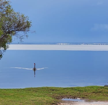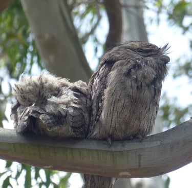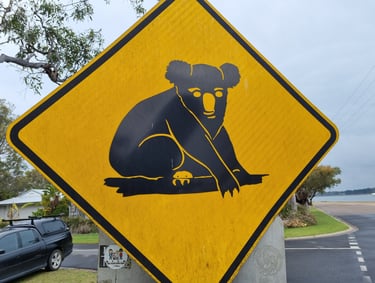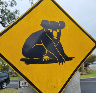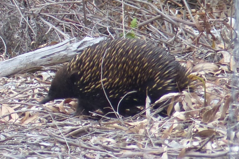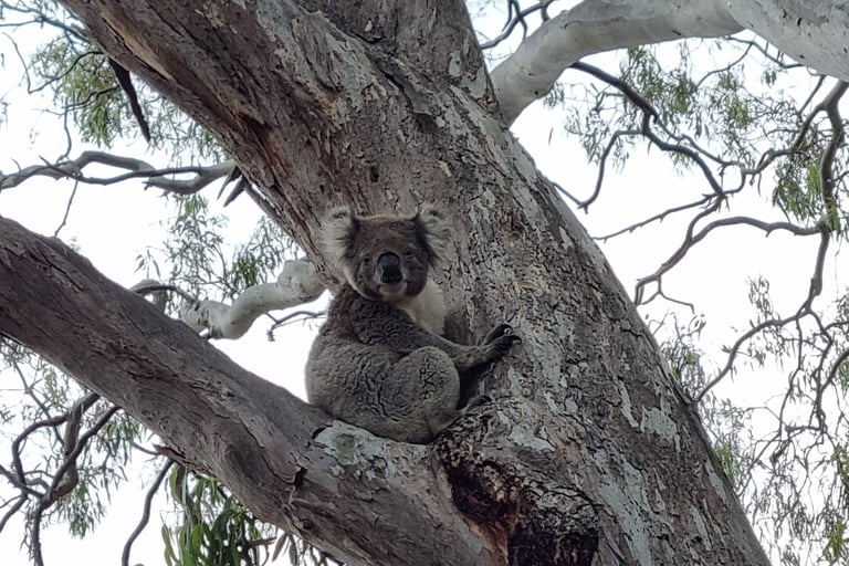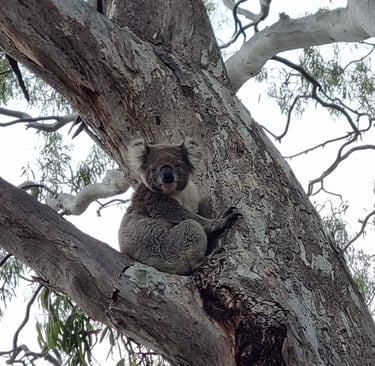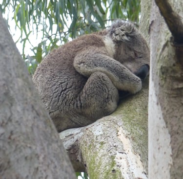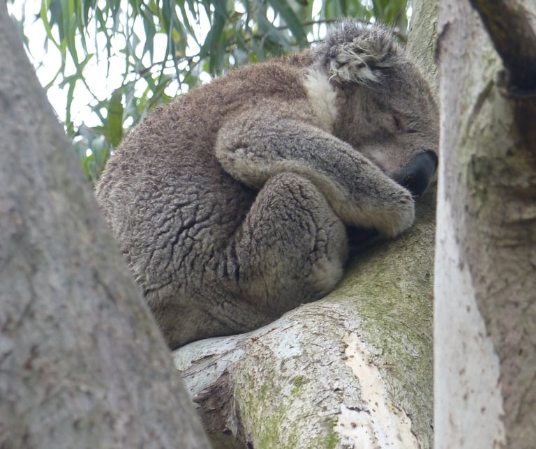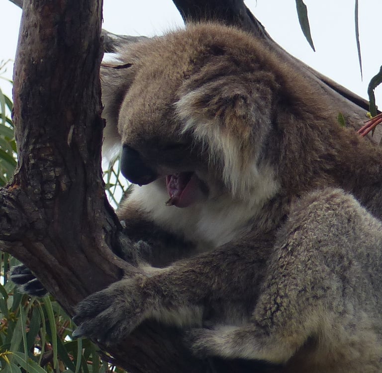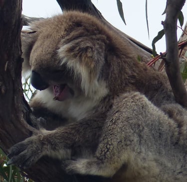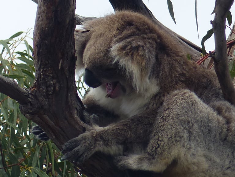 Paynesville liegt an einem der Gippsland-Seen. Dieses sind Seen, die durch eine über 80 km lange Nehrung vom Pazifik getrennt worden sind. Wir haben den Ort Paynesville ausgewählt, da vor ihm die 6 km Insel „Raymond Island“ liegt, auf der es die höchste Koala-Bär-Dichte Australiens gibt. Nachdem wir mit der kleine Passagierfähre übergesetzt haben und gut zweihundert Meter gelaufen sind, entdecken wir den ersten Koala in einem Baum in einer Wohnstraße. Ein kleines Stück weiter den nächsten. Dann entdecken wir in der Straße noch zwei Eulen, die auf einem Ast sitzen. Wir wandern durch eine Busch- und Waldlandschaft und treffen neben vielen Koalas auch auf einen Ameisenigel und ein Känguru, das in einem Vorgarten Gras mümmelt. In der Ferne grummelt ein Gewitter. Wir ziehen uns unsere Regenjacken über, aber nicht proaktiv wegen der möglichen Regenschauer, sondern wegen der progressiv-aggressiven Mücken. Selbst beim Fotografieren setzen sie sich auf die Finger, um Blut zu zapfen, düsen respektlos wie Kamikaze-Flieger ins Gesicht. Am Schluss unserer Runde schauen wir nochmal bei dem Koala vorbei, den wir als erstes entdeckt hatten und verfolgen begeistert, wie er im Gegensatz zu seinen Artgenossen, die i.d.R. 18 oder mehr Stunden schlafen, im Baum hin und her wandert.