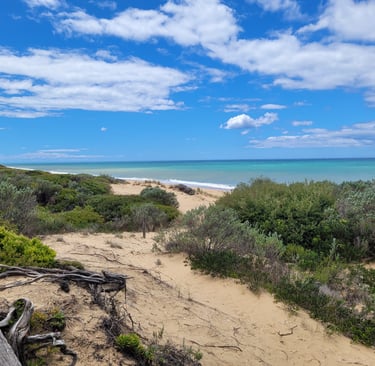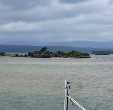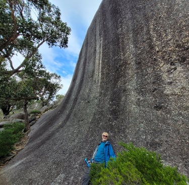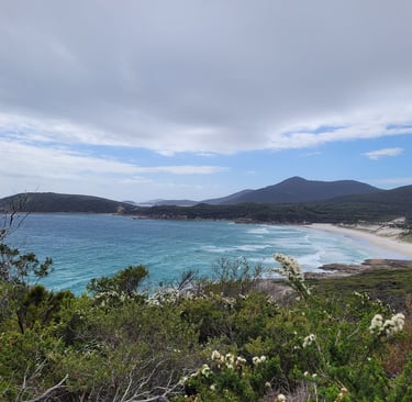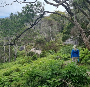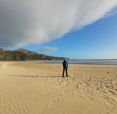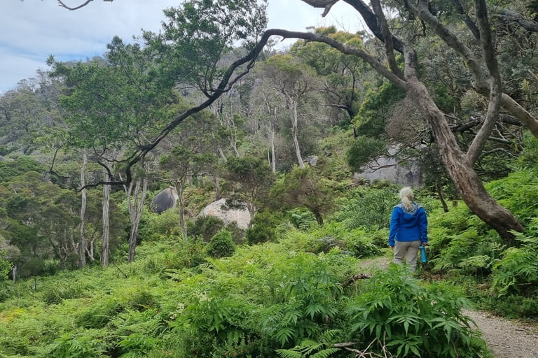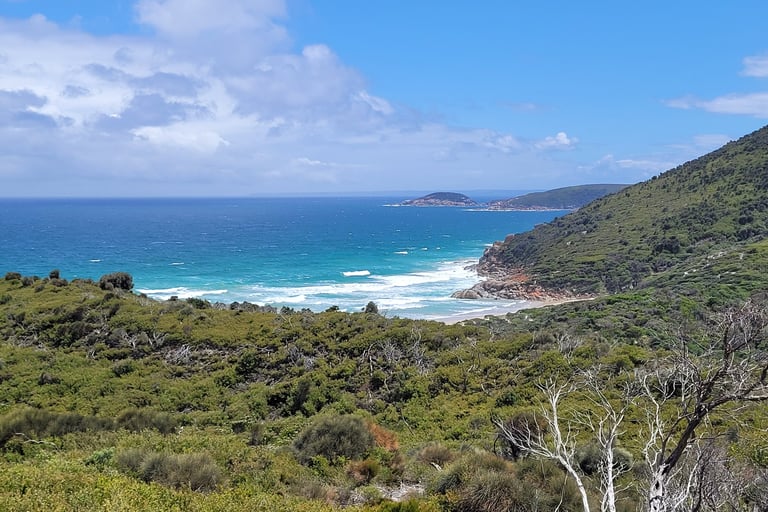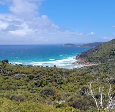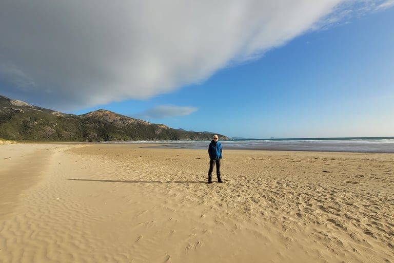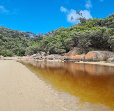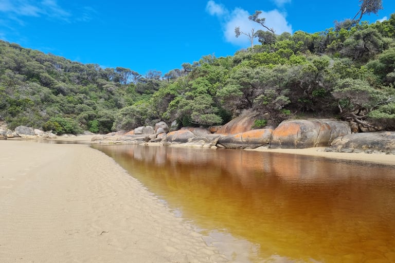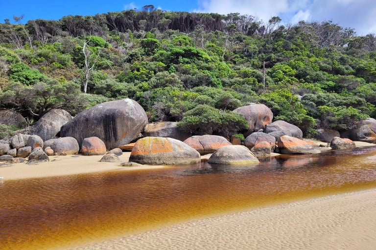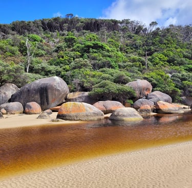 Am nächsten Tag brechen wir zum südlichen Zipfel des australischen Kontinents, dem Nationalpark Wilsons Promontory auf und sind von dieser Halbinsel, mit deren bis auf 550 m ansteigenden Bergen begeistert. Mal erinnert es an das skandinavische Fjäll, dann an Küstenabstriche Sardiniens; zwischendrin kommt die Assoziation „Irland“ und „Neuseeland“. Das Wetter ist sonnig bis wolkig und die Temperaturen liegen zwischen 13 und 18 Grad - auch nordskandinavisch. Wir unternehmen eine schöne Wanderung an der Küste entlang, der uns durch einen verwunschener Wald führt. Immer wieder schauen runde Felsen aus diesem heraus und wir schauen auf die wilden Strände hinab. Unser Campingplatz liegt am Strand und an einem Fluss, dessen unterschiedlichen hell- und rötlichen Brauntöne uns faszinieren.