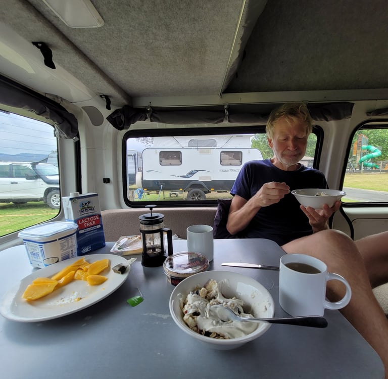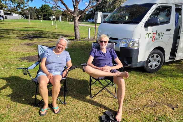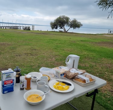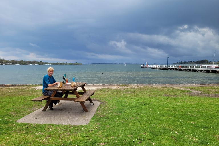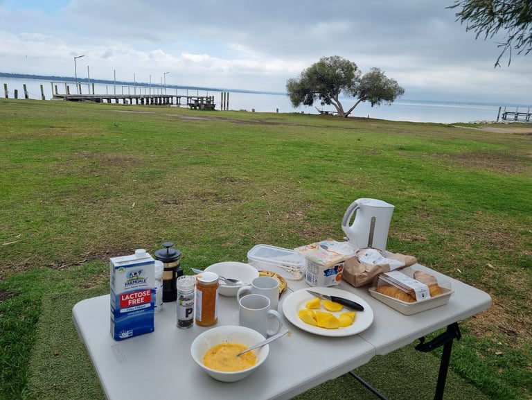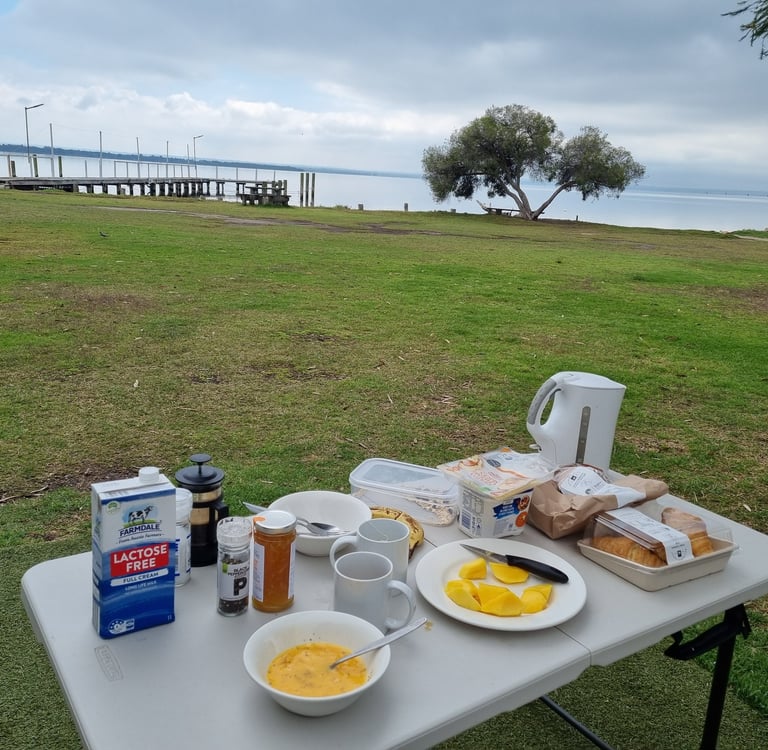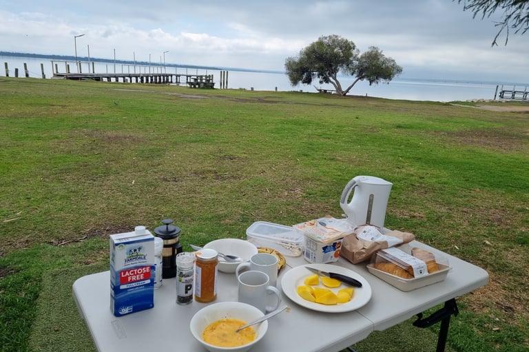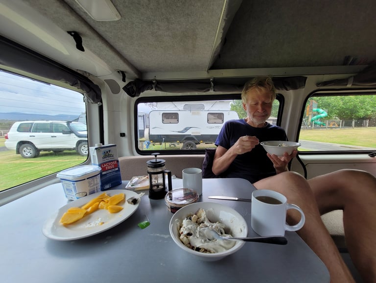 Am zweiten Nachmittag stellen sich Peter und sein Sohn Braham neben uns. Braham hat die Schule gerade beendet und sich gewünscht mit seinem Vater Zelten zu fahren. Peter erkennt an unserem Akzent, dass wir Deutsche sind. Seine Tochter sei gerade für einen dreimonatigen Schüleraustausch in Bonn (By the way, viele Grüße an unsere Bonner Freunde Claudia und Mathias). Vom Wetter nicht gerade die beste Zeit stellen wir fest. Peter, seine Frau und Braham sind vor 18 Jahren von Südafrika nach Australien gezogen. Als ich abends abwasche und Peter vorbeigeht, frage ich ihn, was ihn und seine Familie bewogen habe, Südafrika zu verlassen. Das sei eine längere Story, da hole er erst sein Bier, antwortet er. Die Zeit unter Nelson Mandela schätzte er. Doch in Laufe der Zeit nahm die Korruption immer stärker zu. Als seine Frau mit Braham schwanger war, waren sie auf einer Party bei Freunden. Da es seiner Frau nicht gut ging, verließen sie die Feier vorzeitig. Kurze Zeit später gab es einen Überfall und eine Person wurde erschossen. Dann berichtet Peter von weiteren Ereignissen in Südafrika. Über 90% der Menschen seien gut, aber es gibt immer wieder Gewalt. Er und seine Frau haben sich damals gefragt, ob sie ihre Kinder in einer Gesellschaft, in der man sich nicht unbesorgt frei bewegen kann und Gewalt immer wieder vorkommt, aufwachsen lassen wollen. Sie entschieden schweren Herzens das Land zu verlassen. Auch eine Flüchtlingsgeschichte. Peter fragt uns nach der Situation in Europa. Wir berichten über den Ukrainekrieg, rechte Tendenzen und Verunsicherungen und ergänzen, von daher kann er froh sein, weit weg in Australien zu leben. Dem stimmt er zu, allerdings macht man sich hier in der Pazifikregion Sorgen um die chinesische Politik bzgl. Taiwan. China hat Geduld und verfolgt seine Ziele beharrlich so wie man es auf dem afrikanischen Kontinent sehen könne.