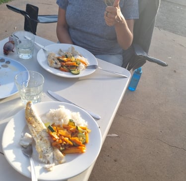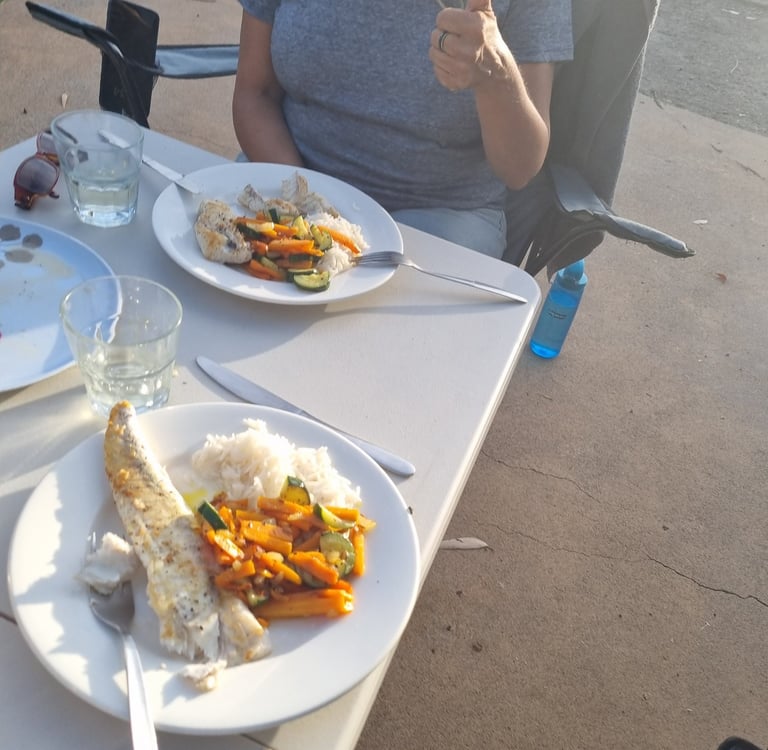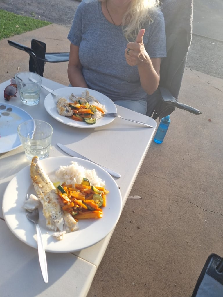 Peter und Braham waren mit einem Freund den ganzen Tag draußen auf dem Pazifik zum Angeln. Sie haben red snapper und flathead gefangen und servieren uns gebratenen flathead-Filet; ein Fisch, der am Meeresboden lebt. Er schmeckt mild und hat festes Fleisch. Sehr lecker. Später schaut Peter bei uns vorbei und fragt, ob er sich zu uns setzen könne und so tauschen wir uns den Abend weiter über Land, Leute und Reiseorte aus. Eine sehr nette und gleichzeitig informativ, interessante Begegnung.