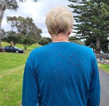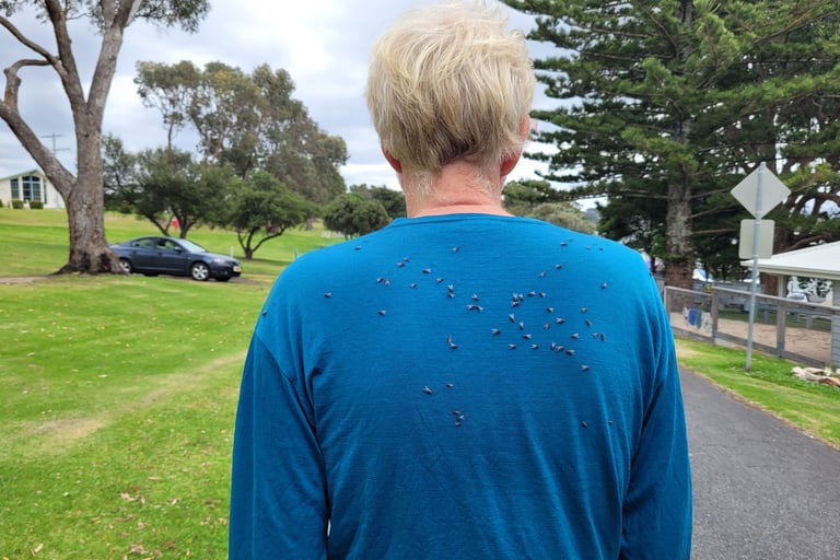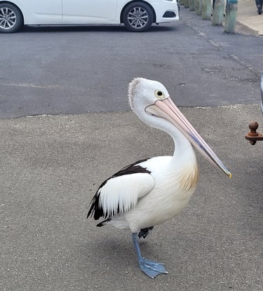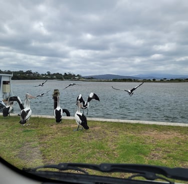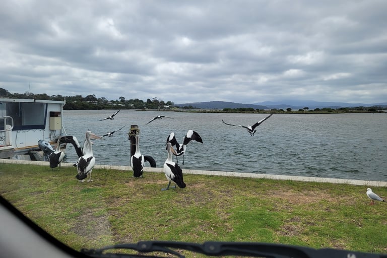 Nach einem Zwischenstopp in Eden zieht es und weiter ins Gippsland. Diese ländliche Region an der Ostküste wird von Australiern gern besucht, ist aber keine klassische touristische Gegend für ausländische Urlauber. Wir biegen vom Princes highway ab, der hier nur noch eine Landstraße ist, ab und besuchen Mallacoota, ein 1.000 Seelenort, das am Ende einer 25 km langen Stichstraße liegt. Uns begrüßen zahlreiche Pelikane am Parkplatz. Im Jahreswechsel 2019 / 2020 gab es in der Region große Buschfeuer. Ca. 4.000 Einwohner und Urlauber wurden von dem Feuer eingeschlossen, flüchteten an den Strand und wurden von der australischen Marine gerettet. Auf unserer heutigen Fahrt passieren wir über Dutzende von Kilometer Eukalyptuswälder mit vom Feuer schwarz verfärbten Baumstämmen und auch viele karge und abgebrochene Bäume. Gleichzeitig gedeihen viele junge, grüne Bäume in diesen Wäldern. Mallacootas Binnengewässer werden durch eine lange vorgelagerte sandige Landzunge vor den Wellen des Pazifik geschützt, südlich schließt sich eine felsige Steilküste an. Viele Angler schätzen diese Gegend. Obwohl die vielen hier beheimateten Fliegen kein adäquates Nähe-Distanz-Verhältnis einhalten, gefällt uns dieser ruhige, entspannte Ort.