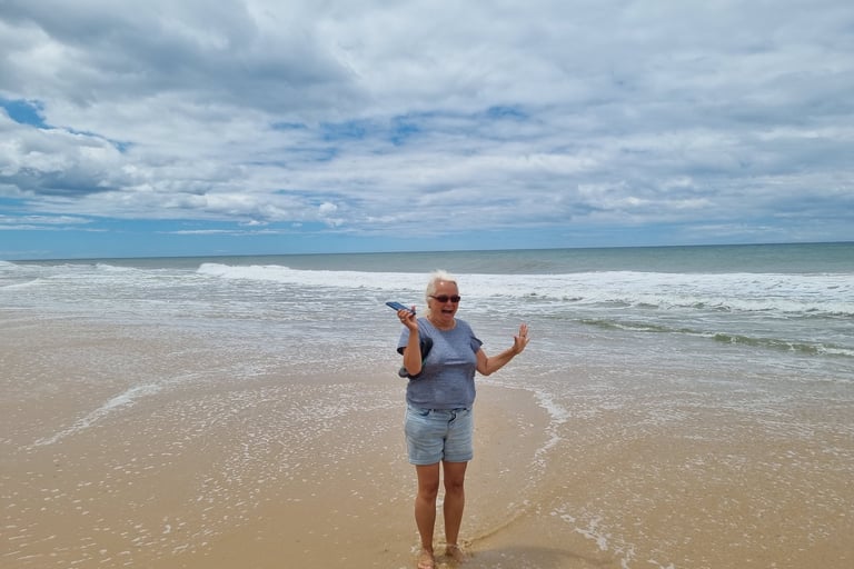 Weiter führt uns unser Weg an der Küste Gippsland entlang. Die Küste besteht hier aus dem geraden über 150 km der Ninety Mile Beach (nomen es omen). Eine Straße verläuft parallel zu diesem. Nicht spektakulär, da gerade und überwiegend von Busch begleitet. Wir machen ab und zu einem Stopp und gehen an den Strand. Dieser sieht eigentlich immer so aus wie 20 km vorher: eine Dünenlinie wie mit dem Lineal über Kilometer gezogen, dahinter Sandstrand mit brechenden Wellen. Keine Buchten, keine Häfen, aber trotzdem wunderschön.