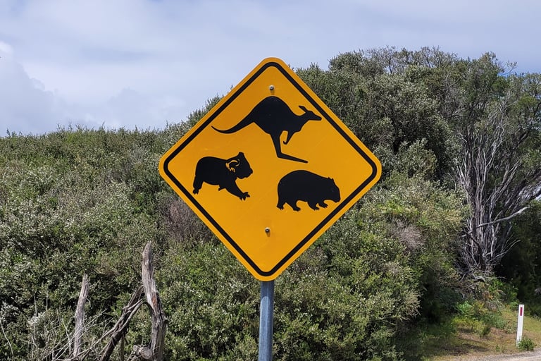 Tagsdrauf wandern wir durch eine Ebene und sehen Kängurus und Emus. Nachdem wir einen Busch, bei dem eine Kängurumutter mit ihrem Jungen im Schatten stand, zwanzig Meter passiert hatten, drehe ich mich nochmal zu den beiden um und sehe, wie eine Schlange aus dem Busch gemütlich den Weg quert. Wie nett, dass sie uns hat vorher diesen ungestört passieren hat lassen. Wir setzen unsere Fahrt fort, besichtigen einen kleinen Skulpurenpark in Fish Creek und nähern uns dem Großraum Melbourne, den wir nördlich liegen lassen wollen, um zur Great ocean road zu gelangen.