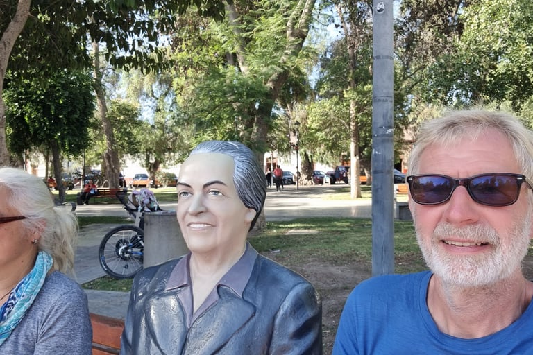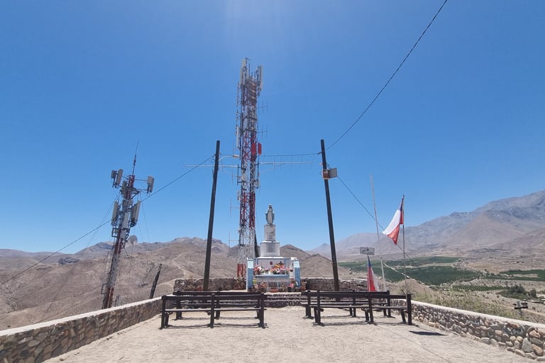 Ich unternehme noch eine kurze Wanderung auf einen Hügel. Oben angekommen treffe ich auf eine Marienstatue, die von den hohen Masten der Neuzeit bewacht wird. Für Gläubige stehen ein paar Kirchenbänke davor. Schon auf der Hinfahrt haben wir uns gefragt, wie Wein hier angebaut werden kann. Auf den kargen Berghänge wachsen Kakteen und Sukkulenten und im Tal erblicke ich üppige grüne Weinfelder. Schmelzwasser kommt aus den Anden und zwei Stauseen versorgen das Tal mit Wasser, erfahren wir von der Tourismusinformation.