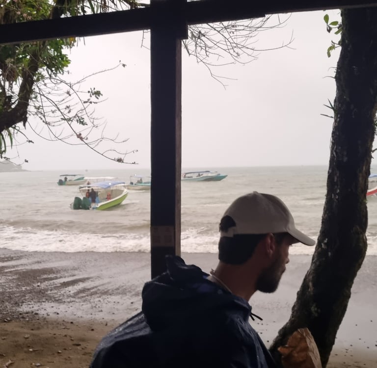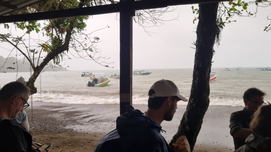 Wir haben die Tour am Donnerstag gebucht. In der Nacht von Mittwoch auf Donnerstag werden wir um 0.30 Uhr von Regen geweckt, der ein paar Stunden anhält. Das kann ein matschiger Tag werden, denke ich. Um 5.00 Uhr klingelt der Wecker, ein schnelles kleines Frühstück und im Regen gehen wir zum Strand, wo wir um 6.00 Uhr unseren Guide Roy treffen. Eigentlich hatten wir auf einen romantischen Sonnenaufgang als Kick-off gehofft. Roy sagt, er mag das Wetter und ist froh, dass wir so eine kleine Gruppe von sechs Personen nur sind: Luisa und Fabio aus Uruguay sowie Dan und Bratt aus Großbritannien. Eine sehr nette Truppe. Zum Nationalpark müssen wir eineinhalb Stunden mit dem Boot fahren. Folglich heißt es: Schuhe aus, Hose hochkrempeln und in alter Kneipmanier vom Strand zum Boot watscheln.