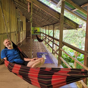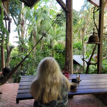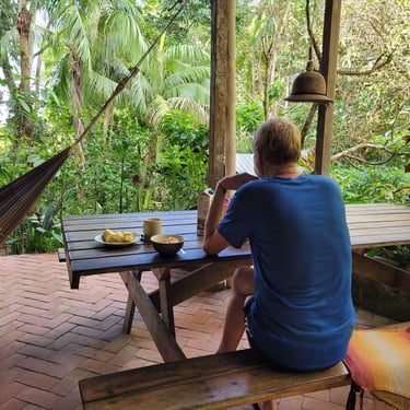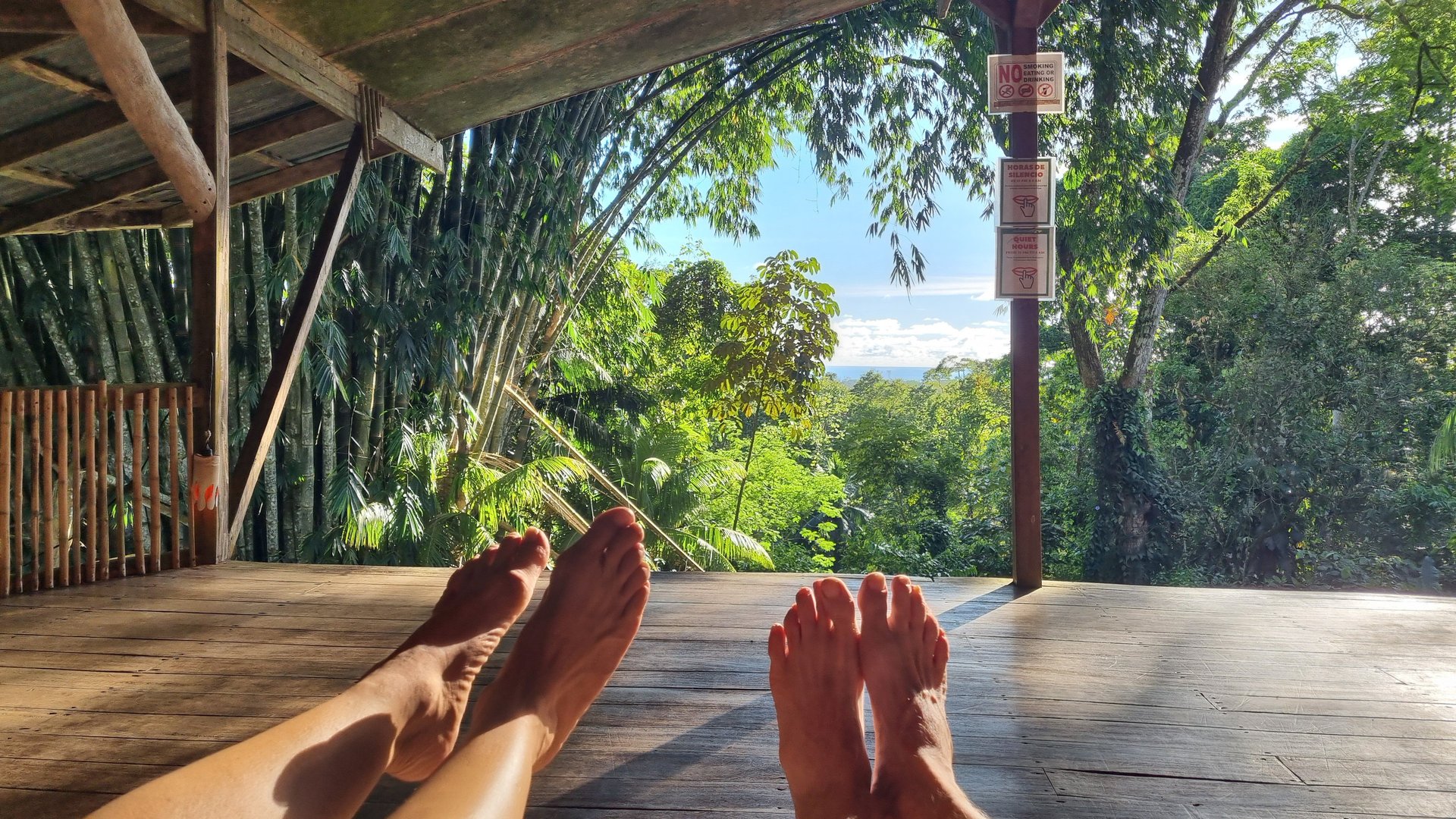 Vom oberen Deck schauen wir direkt wie durch ein Fenster zwischen den Bäumen hindurch auf das weiter entfernt liegende Meer, während Zikaden tagsüber einen Soundteppich um die Unterkunft legen. Nachts übernehmen einzelne Frösche das Zepter. Eine sehr entspannte Atmosphäre bringt uns dazu den ganzen Tag in bequemen Holzsesseln durch dieses Bio-Fenster zu schauen und ein wenig vor uns hin zu philosophieren.