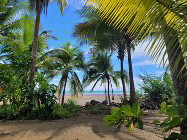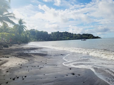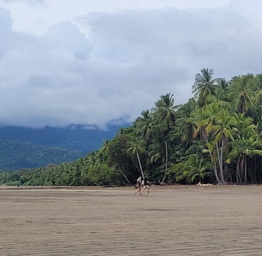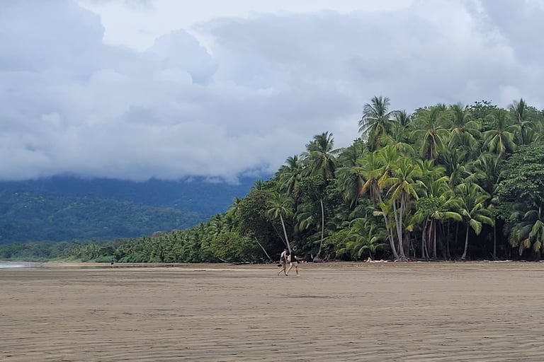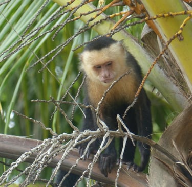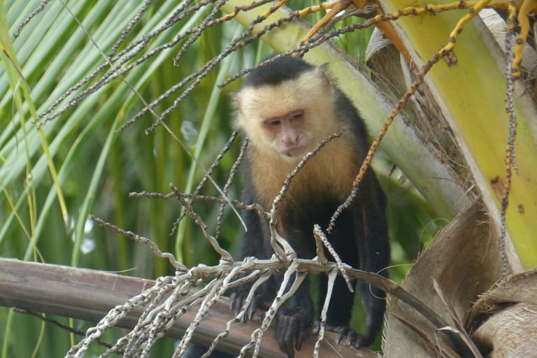 Anschließend schlendern wir den schönen von zwei Seiten vom Meer umschlungenen Walflossenstrand entlang. Wir entdecken vom Strand aus eine Horde Kapuzineräffchen, die durch den Palmwald, der auch zum Nationalpark gehört, toben. Im Strandwald stoppen wir abrupt, da eine Arbeitskolone von Blattschneideameisen fleißig und wohlgeordnet unseren Weg kreuzt. Nach so vielen netten Erlebnissen entern wir hungrig ein Soda (=einfaches Restaurant) und essen das Nationalgericht Casado zu Mittag. Dieses besteht aus Reis, Bohnen, Fleisch oder Fisch plus Kochbananen, Salat. Es variiert meist; so können auch Kartoffeln, Gemüse, Avocado oder Ei dazugehören.