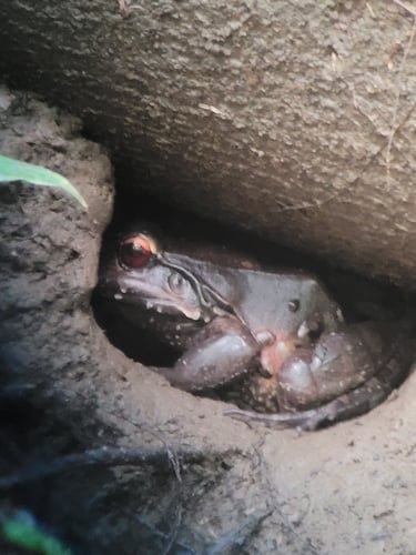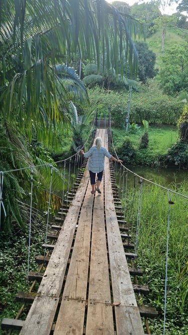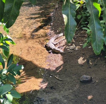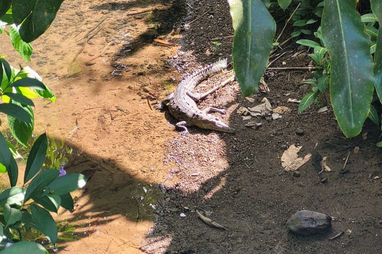 Wir lernen Miriam, die nette Inhaberin unserer Unterkunft kennen. Ihre Unterkunft liegt an einem kleinen Fluss. Dann geht sie mit uns zu der kleinen Brücke, die zu ihrem Wohnhaus führt und zeigt uns das Krokodil, das ihren Flussabschnitt zu seinem Zuhause erkoren hat. Ein ca. ein Meter kleines Wesen liegt am schmalen Bachufer. Was denn passiert, wenn es weiter wächst, fragen wir. Irgendwann wird es dann Fluss abwärts schwimmen, um ein größeres Revier zu haben.
