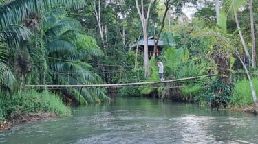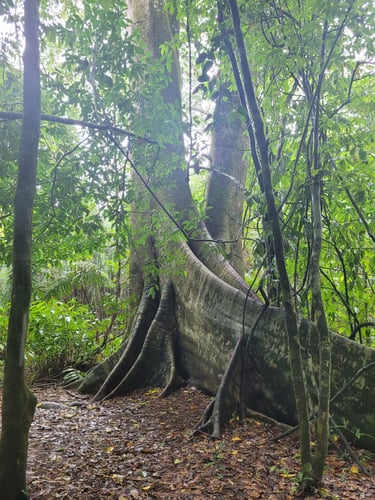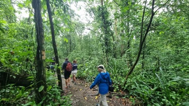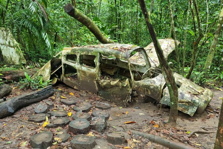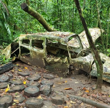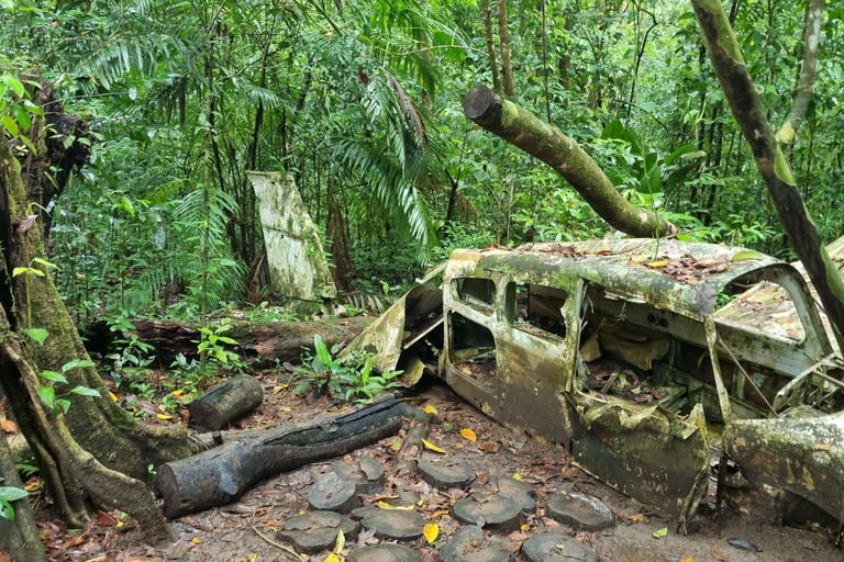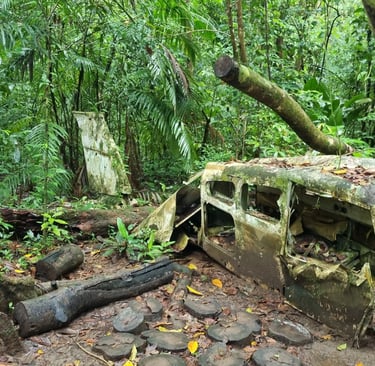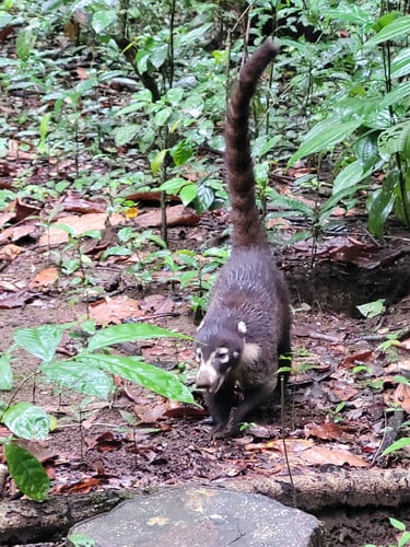 Eine Horde von Nasenbären kreuzt unseren Weg. Alle strecken ihre Schwänze senkrecht in die Höhe und man sieht diese durch Buschwerk umherflitzen. Irgendwie erinnert es an die Stromabnehmer von Autoscootern auf dem Jahrmarkt. Mitten im Wald treffen wir plötzlich auf zwei alte Flugzeugwracks. Bevor es Nationalpark wurde gab es eine kleine private Landepiste aus Gras. Ein Flugzeug wurde hier zurückgelassen und das andere verunglückte bei einer Landung und verlor einen Flügel. Glücklicherweise haben alle Insassen überlebt, erwähnt Roy. In der Rangerstation, die an dem alten Flugfeld liegt, bekommen wir und die anderen bis zu 250 Tagesgäste ein Mittagessen, bevor wir weiter den Regenwald erkunden. Die Temperaturen sind angenehm. Wenn die Sonne geschienen hätte, wäre der Tag laut Roy einiges heißer und schwüler gewesen. So ein bewölkter Tag mit Nieselregen bietet also auch Vorteile. Tapire hätten wir gerne noch gesehen, doch heute haben sie sich versteckt. Der Ausflug hat uns sehr gefallen. Zurück geht es erneut per orthopädisch unvorteilhafter Schnellbootfahrt. Eine Dusche und trockene Kleidung bilden die weiteren Highlights des Tages.
