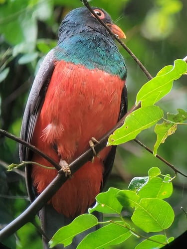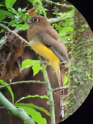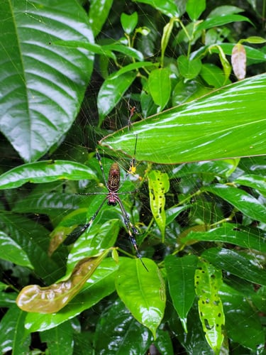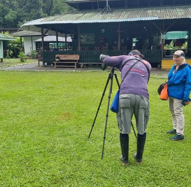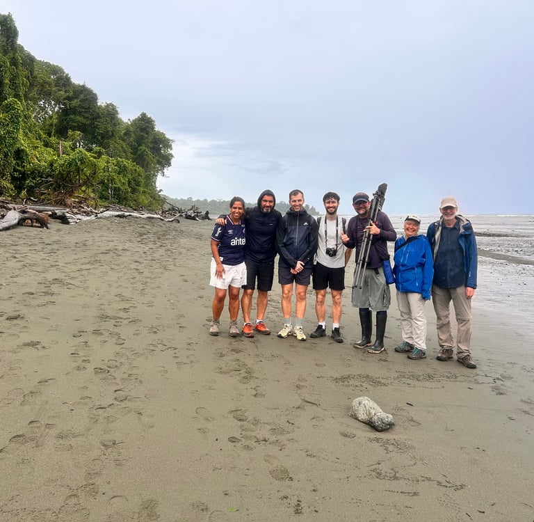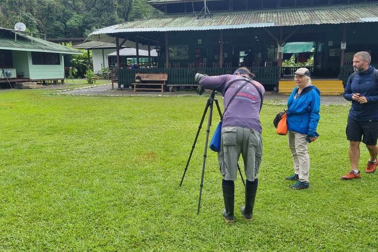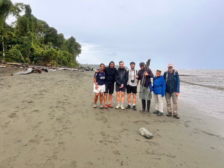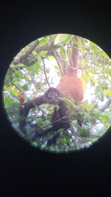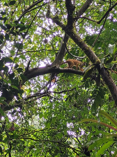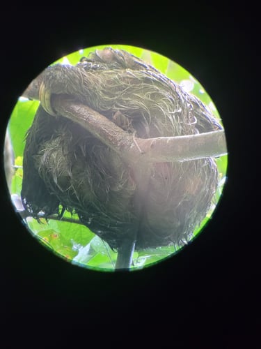 Roy entdeckt sofort die Spider-Monkeys, die sich mit ihrem kräftigen Schwanz an den Bäumen festhalten. Kurze Zeit später entdeckt er die kleinste Affenart Costa Ricas, die Mittelamerikanischen Totenkopfaffen. Putzige Tiere, die über uns mit beachtlichen Sprüngen von einem Baum zum anderen wechseln. Wir sehen verschiedene bunte Vögel. Roy hat ein Teleskop mit. Dadurch können wir die Tiere ganz genau sehen. Selbst wenn ein Vogel weit oben oder entfernt in einem Baum sitzt, können wir jede einzelne Feder sehen. Wir wandern durch den Regenwald und auch am Strand entlang. An Flussufern gilt es zur eigenen Sicherheit nach Krokodilen Ausschau zu halten. Einen Fischadler, der einen Fisch auf einem Baum verzerrt, entdeckt Roy. Auch ein Faultier bekommen wir zu sehen. Leider hat es sich zu einer Kugel zusammengerollt. Bei dem Wetter nachvollziehbar.