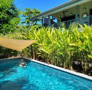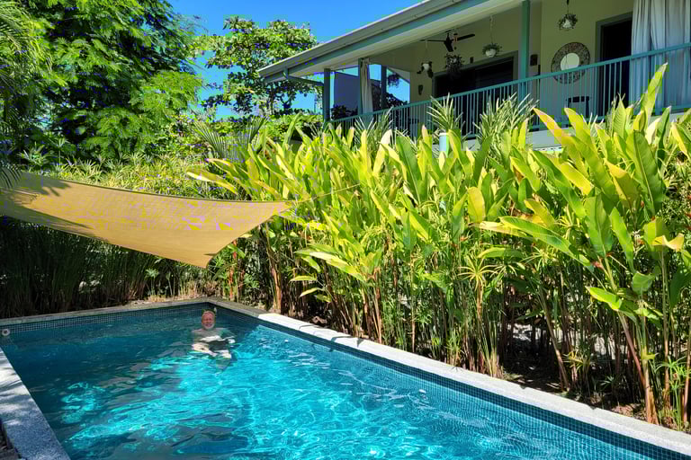 Von Drake Bay nehmen wir die bekannte Strecke und fahren wieder nach Uvita. Dieses Mal hat Ruth uns eine tolle Unterkunft oberhalb des Ortes im Dschungel ausgesucht. Die Unterkunft ist bis auf die Zimmer, die durch Bambus, dünne Wände oder Baumwolltüchern abgeteilt sind, offen gehalten. Vor über fünfundzwanzig Jahren hat ein Ingenieur aus Dresden diese Unterkunft entworfen. 2010 verliebte sich ein Berliner Pärchen in das Holzhaus und übernahm es.