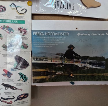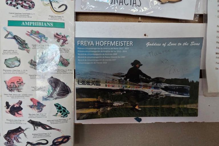 An der Rezeption entdecken wir zwischen diversen Zetteln eine Autogrammkarte mit Widmung für Miriam von Freya Hoffmeister. Für die nicht in der Kajakszene bewanderten unter den Lesern eine kurze Erläuterung zu Freya Hoffmeister. Freya kommt aus Husum, betreibt zwei Eisdielen und hat als erste Frau sowohl die Südinsel von Neuseeland als auch Australien und Südamerika im Kajak umrundet. Wir haben einmal einen Vortrag in unserem Kajakverein von ihr über ihre Umrundung von Südamerika gehört. Eine Extremsportlerin! Und wieso hängt eine kleines Bild von ihr an der Pinnwand, frage ich Miriam. Das hat ihr die Frau geschenkt, als diese vor ca. drei Jahren bei ihr übernachtet habe. Sie hatte ein riesiges Kayak und Miriam fand beachtlich, was alles in dieses hineinpasste. Miriam wusste nur, dass sie an der Küste bis Panama weiterpaddeln wollte, was sie schon eigentümlich fand. Als ich Miriam etwas mehr über Freya erzähle, schaut sie uns mit großen Augen an. Das habe sie nicht gewusst. Whow! Die Kajakwelt ist klein, zufällig übernachten wir in der gleichen Unterkunft wie Freya vor drei Jahren.