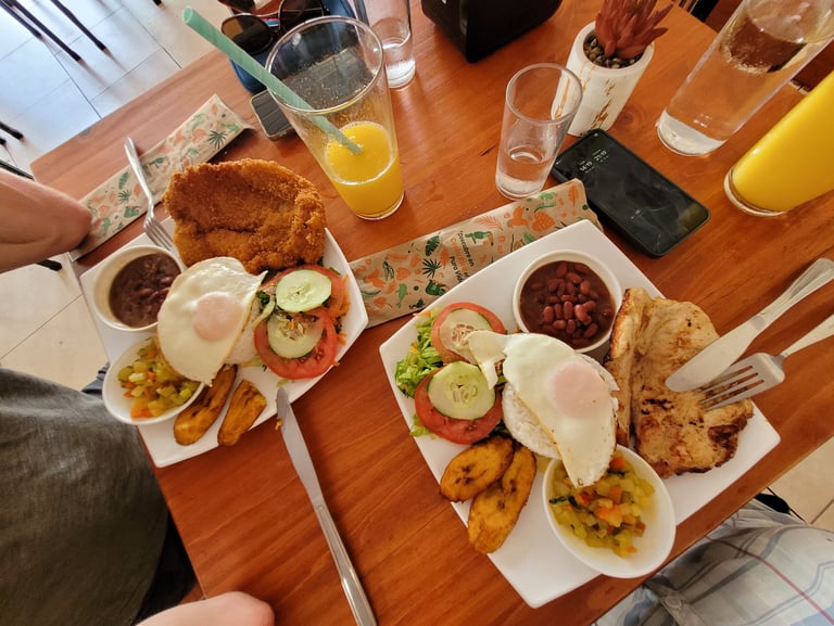 Nach einem Zwischenstopp von sechs Stunden in Lima erreichen wir den Flughafen der Hauptstadt Costa Ricas. 80 Minuten stehen wir in der langen Schlange vor dem Immigration office. Eine kurze Diskussion mit der Beamtin, die unsere Unterkunft für die erste Nacht nicht kennt. Wenigstens können wir unsere Weiterflugtickets vorzeigen. Ohne dieses hätten wir gar nicht einreisen können. Zügig erreichen wir unsere Unterkunft. Der Sohn der Inhaberin empfängt uns. Er fragt, von wo wir anreisen und wir nennen Argentinien. Salta kennt er auch und dann erfahren wir, dass er in der Schweiz mal in eine junge Dame verliebt war und dass er in der Bretagne zum Schüleraustausch war. Und schon reden wir über die Bretagne. Zufällig lesen Ruth und gerade einen Krimi, der in der Bretagne spielt. Seine Mutter kommt dazu und sie empfehlen uns ein Restaurant. Karibisches Essen; Kokosmilch als Grundlage, aber anders als in Asien gewürzt. Sehr delikat.