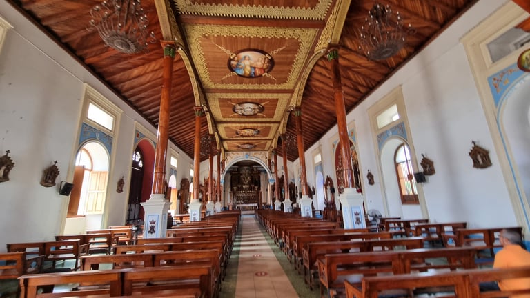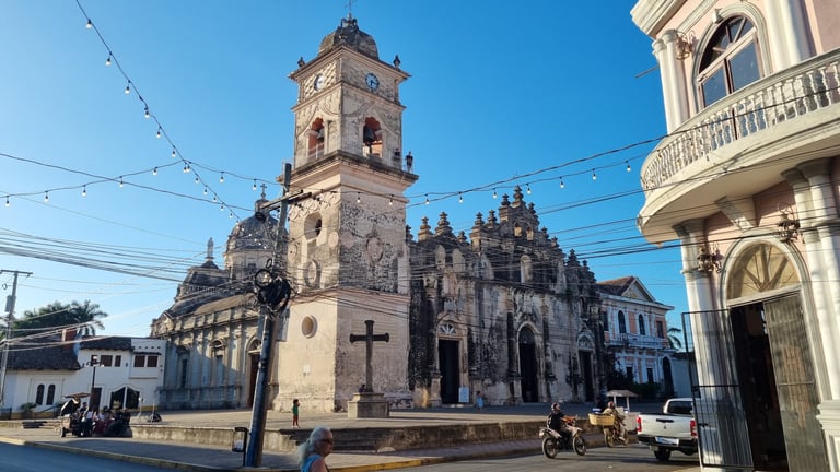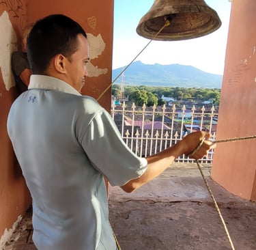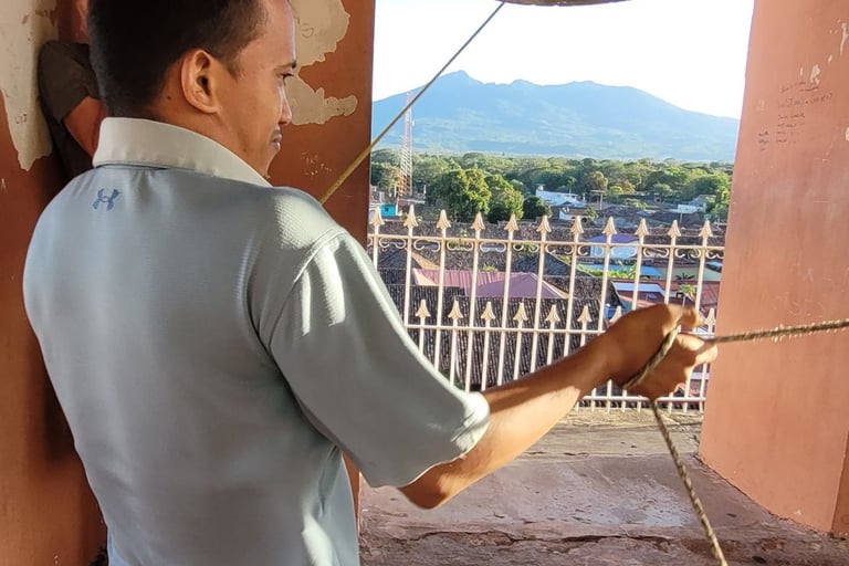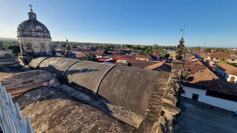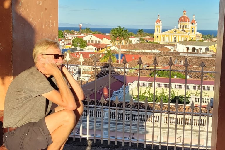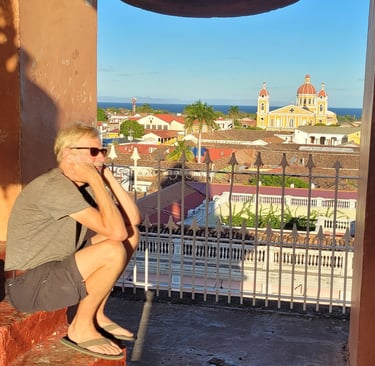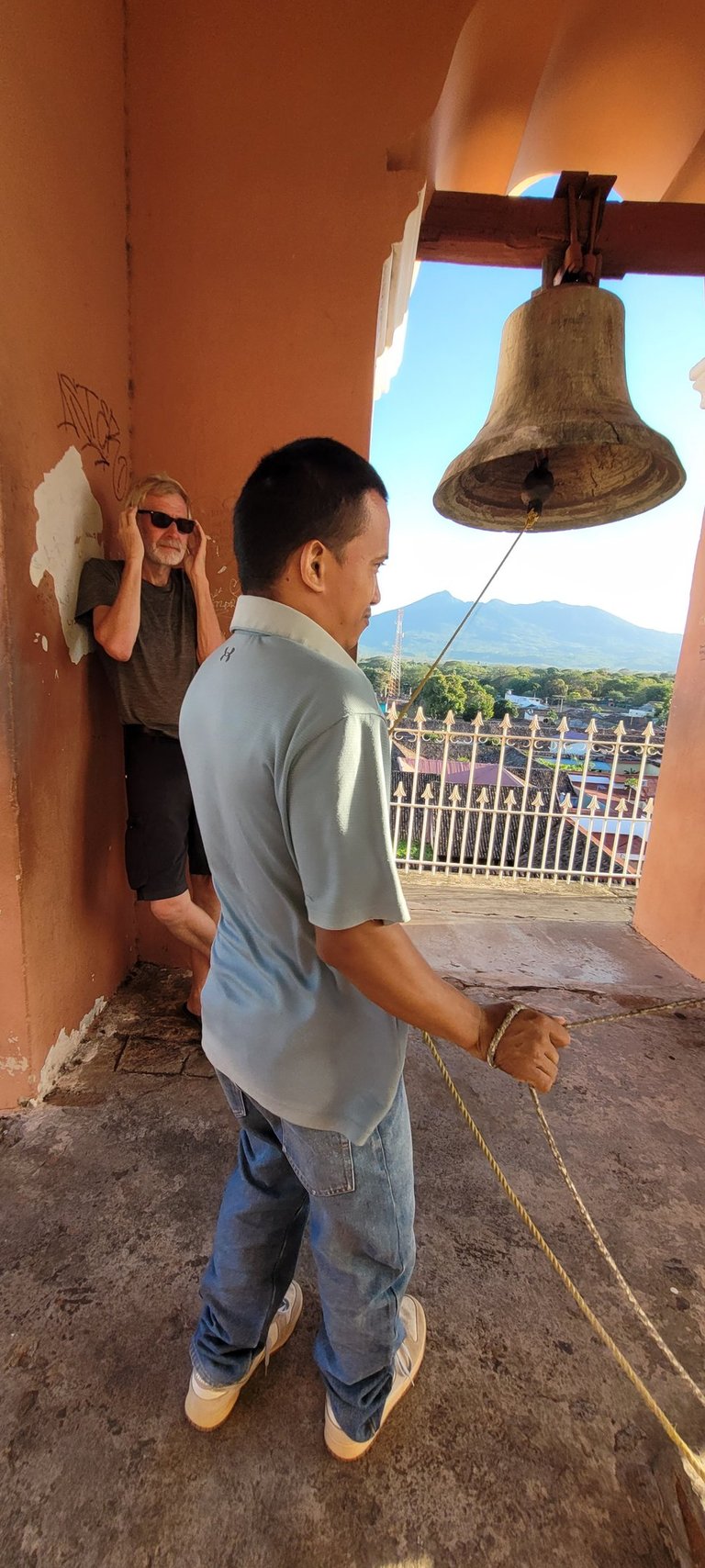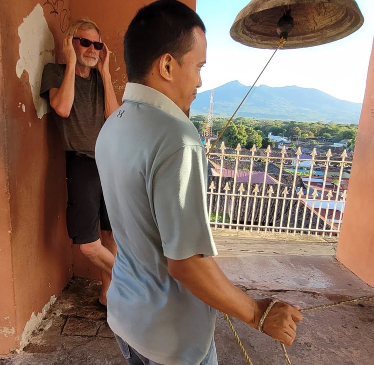 Weiter ziehen wir an den bunten Häusern vorbei zum Anleger am Lago Cocibolca (Nicaraguasee), der 15 mal so groß wie der Bodensee ist. Der alte Pier stammt noch aus der Epoche bevor die Schifffahrt durch die Lastkraftwagen ersetzt wurde. Hier wirkt alles etwas aus der Zeit gefallen. Nach der Siesta besuchen wir spätnachmittags die Kirche „Parroquia de Nuestra Señora de la Merced“, deren Glockenturm wir über einen sehr enge Wendeltreppe erklimmen und von dort genießen wir einen schönen Rundblick über Granada. Je nach Himmelsrichtung wird eine andere Aussicht angeboten. Nach Osten schweift der Blick über die Stadt mit Kathedrale bis zum Nicaraguasee. Im Süden erhebt sich der Mombacho-Vulkan. Weitere Stadtviertel erblicken wir im Westen und Norden. Um fünf Uhr kommt ein junger Mann und gibt uns non verbal zu verstehen, uns die Ohren zuzuhalten. Und dann legt er los. Er zieht kräftig an zwei Seilen und schlägt die nicht einmal zwei Meter von uns entfernt hängenden zwei Glocken. Whow - good vibration.