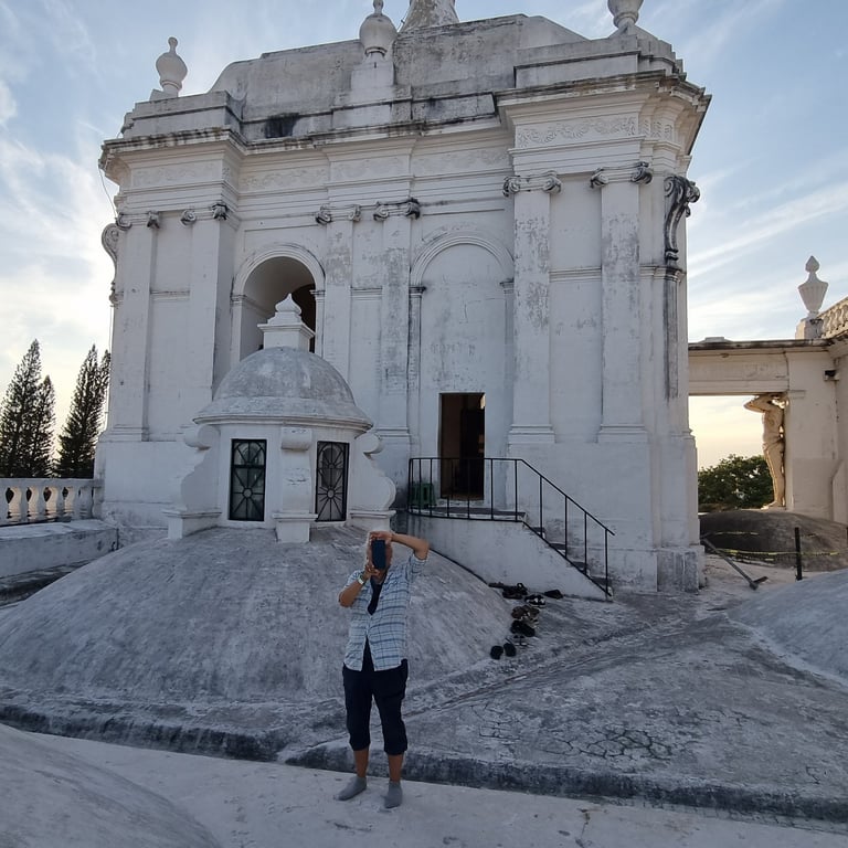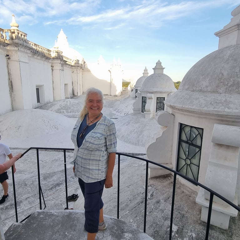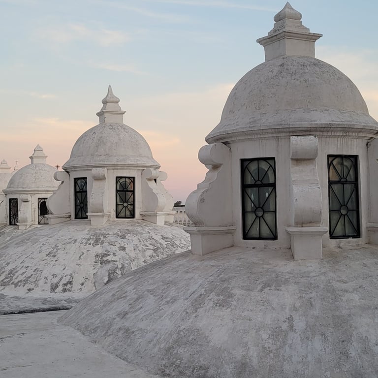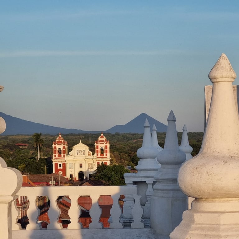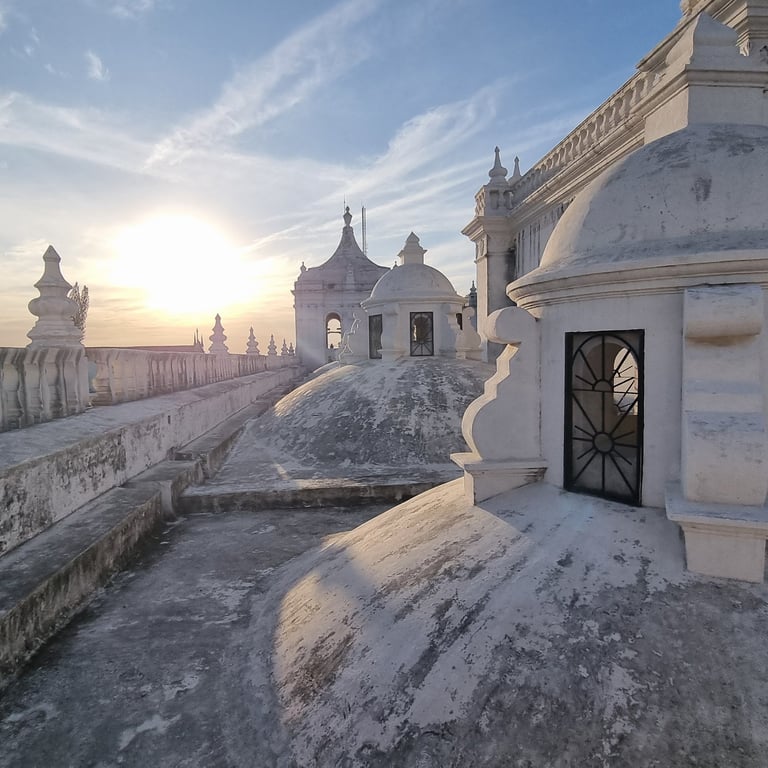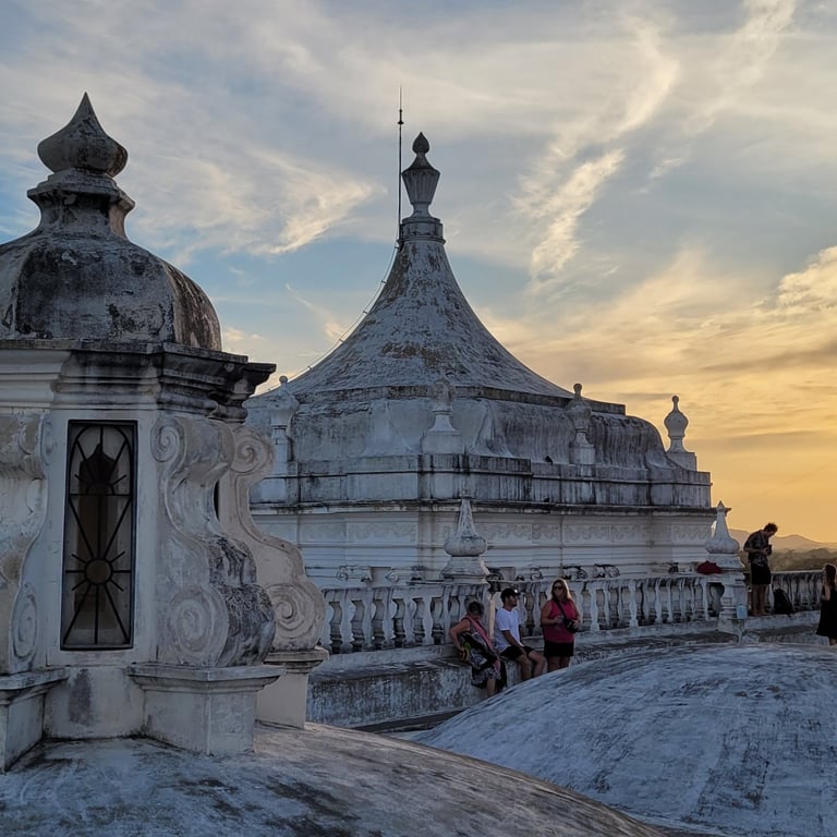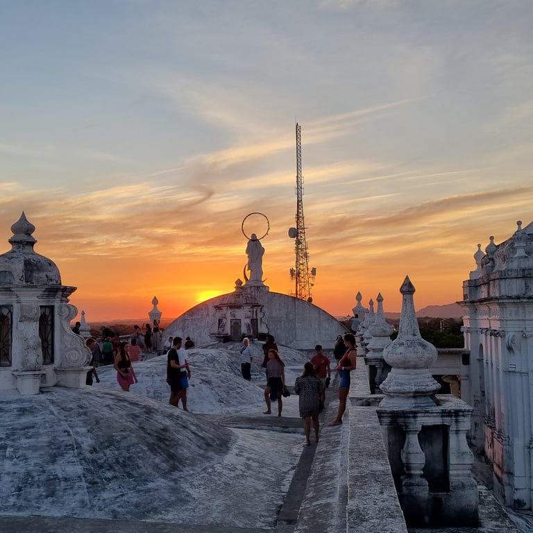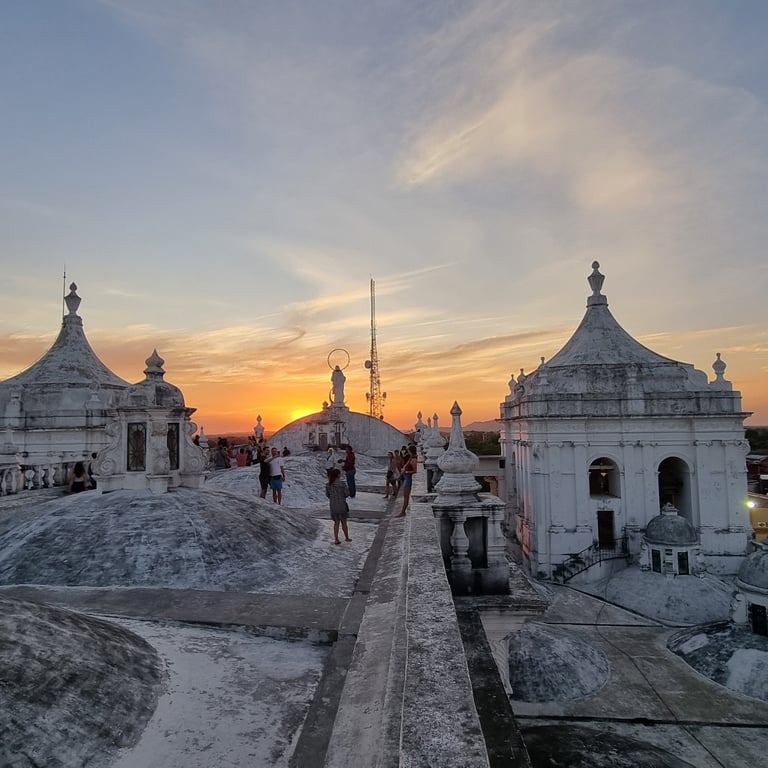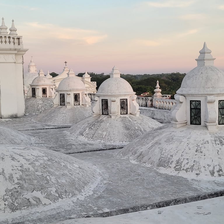 Am Spätnachmittag unseres dritten Tages in León erklimmen wir über eine schmale Treppe das Dach der weißen Kathedrale und sind berauscht von der Atmosphäre und dem Ausblick. Vulkane umgeben die Stadt, einer raucht leicht und die Architektur der Kathedrale begeistert uns. Spontan denken wir beide an Gaudis Casa Milà in Barcelona, dessen Dach wir einst auch besucht haben. Je nach Blickwinkel variieren unsere Assoziationen. Mal erinnert uns die Architektur an griechische Kirchen oder auch an buddhistische Stupas. Die Sonne senkt sich langsam und beleuchtet die weiße Kathedrale mit ihrem warmen Licht. Was für ein schöner Abschied.