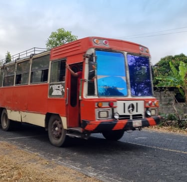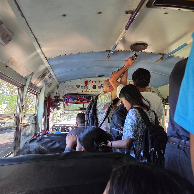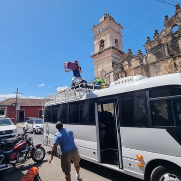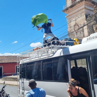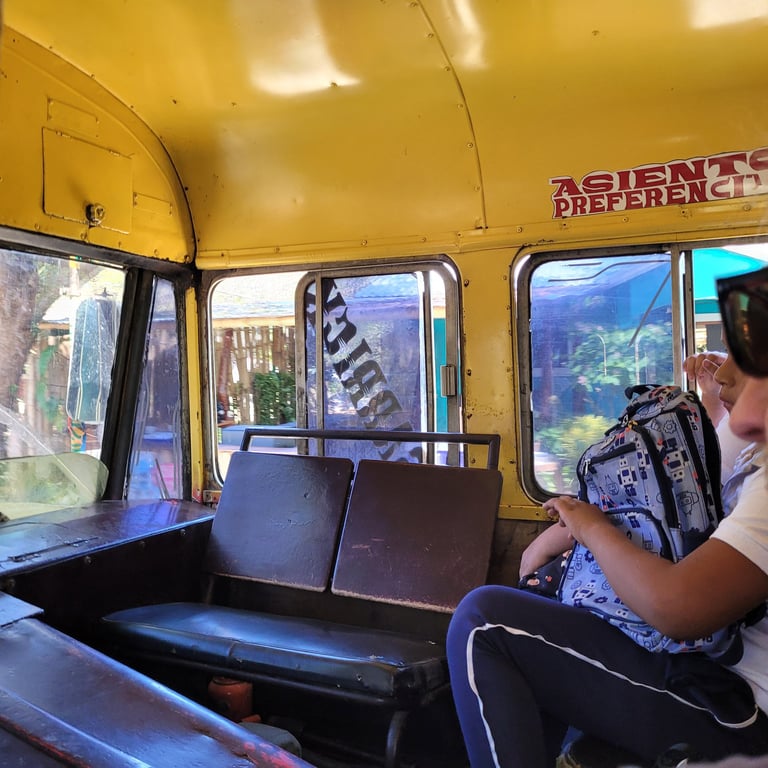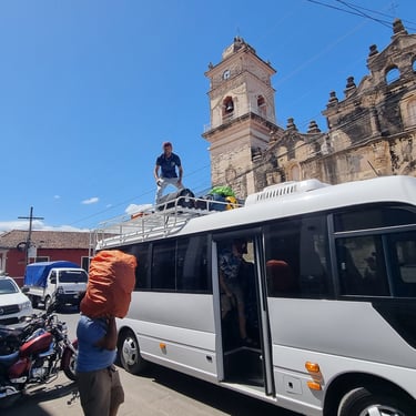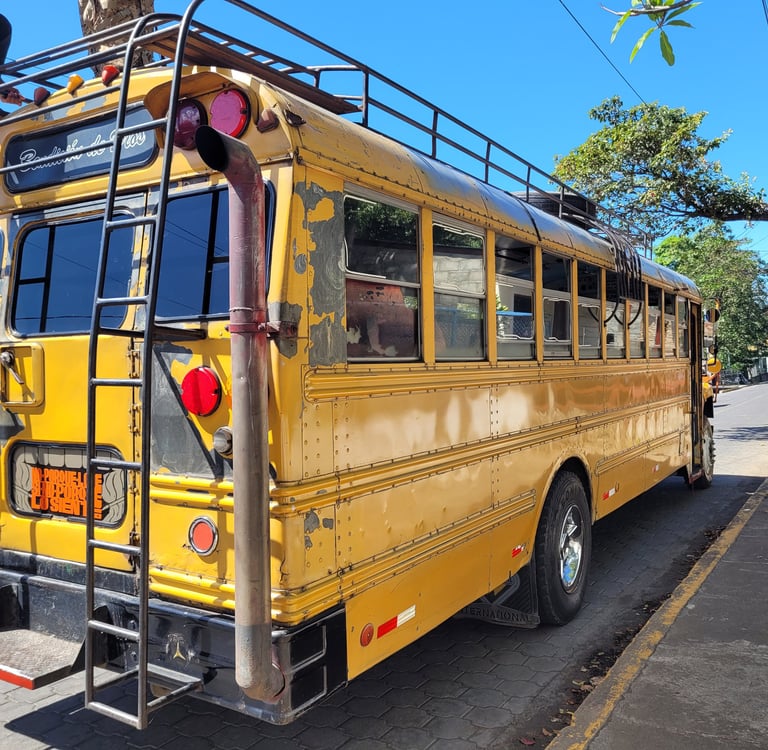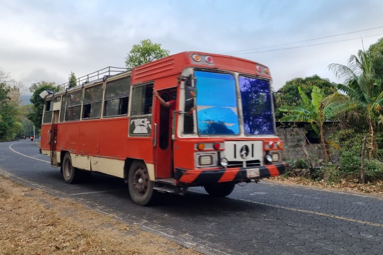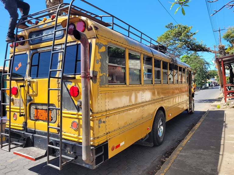Wir wechseln unsere Unterkunft und ziehen für eine Nacht nach Moyogalpa. Von dort wollen wir am nächsten Tag früh eine Fähre nehmen, da uns die lange Rückreise nach Costa Rica bevorsteht. Für die 28 Kilometer nach Moyogalpa nehmen wir den lokalen Bus, den sogenannten Chickenbus. Wir stehen am Straßenrand, winken als der Bus erscheint. Ein alter ausgemusterter amerikanischer Schulbus, von denen viele den öffentlichen Nahverkehr in Nicaragua aufrechterhalten. Immer wieder hält er an, wenn jemand am Straßenrand winkt. Gemeinsam mit einheimischen Erwachsenen und einigen Schülern fahren wir neun Kilometer bis zur nächsten Kreuzung. Dort steigen wir aus und warten auf den Bus, der zum Fährhafen fährt. Zwanzig Minuten später kommt der und ist eigentlich schon rappelvoll. Unser Rucksack kommt aufs Busdach. Dieses Mal wird er nicht festgezurrt, wie wir es von unseren bisherigen Shuttlebussfahrten kennen. Hoffentlich wird er nicht durch eine Bodenwelle heruntergeschleudert, denken wir. Doch der Bus fährt mit so geringer Geschwindigkeit, das entsprechende Beschleunigungsmomente physikalisch ausgeschlossen sind. Immer wieder hält der Bus an, weil Menschen ein- und aussteigen wollen. In der letzten Reihe werden Zementsäcke transportiert, dann steigt jemand mit einer kompletten Bananenstaude ein, die zwischen die Zementsäcke gesteckt wird. Aus den Lautsprecher schallt nette Salsamusik und wahrlich es passt zu dieser Engtanzparty auf vier Rädern, wo alle stehende Gäste ihre Hüften eng aneinander reiben. Und der Eintritt beträgt lediglich 45 Cent für die fahrende Diskothek. Nach eineinhalb Stunden erreichen wir unser Ziel. Mancher wird sich sicher fragen, warum wir nicht wie auf dem Hinweg ein Taxi für 20 Dollar nehmen. Doch mein Wunsch ist dieses Reisegefährt und diese Reiseform kennenzulernen. Ich will nicht nur gepampert im wohl temperierten Shuttlebus sondern auch mit dem Hauptreisegefährt Lateinamerikas, diesen reichlich in die Jahre gekommenen ehemaligen orangefarbenen amerikanischen Schulbussen, die an jeder Ecke anhalten, durchs Land reisen. Ruth lässt sich mir zu Liebe drauf ein. Lächelnd mit dezentem Kopfschütteln blickt sie mich immer wieder während der Fahrt an. Allein für diesen Blick hat sich das Unterfangen gelohnt.