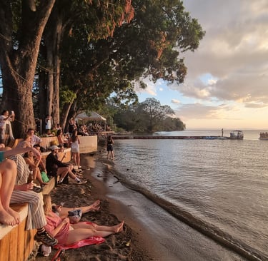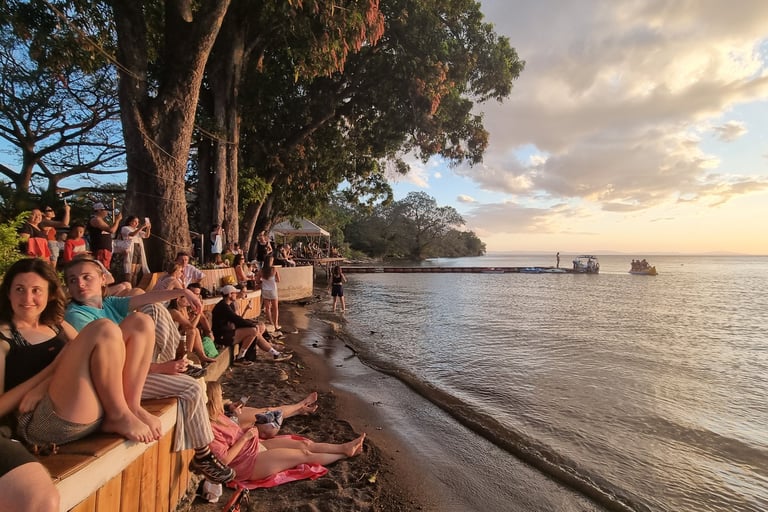 Zum Sonnenuntergang fahren wir zum kleinen Playa Mango. Von der Inselstraße biegen wir in den ca. zweihundert Meter lange Stichweg ein und am Ende des Weges kommt das große Aha-Erlebnis oder vielleicht passender formuliert Oha-Erlebnis. Dutzende von Quad als auch um die hundert Motorroller verteilen sich auf dem Parkplatz. Hier tummeln sich also all die Touristen. Der von Bäumen gesäumte Strand ist schmal. Viele Gäste schlürfen ein Getränk im Beachclub. Sechs lassen sich auf einer aufblasbaren Banane von einem Motorboot übers Wasser ziehen und fallen regelmäßig rein. Es gibt einen Steg und eine Badeplattform im See. Wir schauen uns den Sonnenuntergang noch an und verlassen dann zügig das Gewusel.