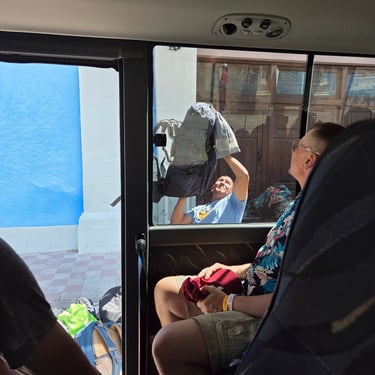 Mit dem Shuttle reisen wir in eineinhalb Stunden von Granada zum Hafenörtchen San Jorge. Vorher beim Beladen des Busses zucken alle Fahrgäste kurz, als der Fahrer den ersten Koffer aufs Busdach wirft, wo sein Kollege diesen souverän auffängt. Auch alle weiteren Koffer und Rucksäcke fliegen vom Bürgersteig mit einer Leichtigkeit nach oben als ob es sich um Basketbälle handeln würde. Unser Fahrer braucht kein Fitnessstudio.