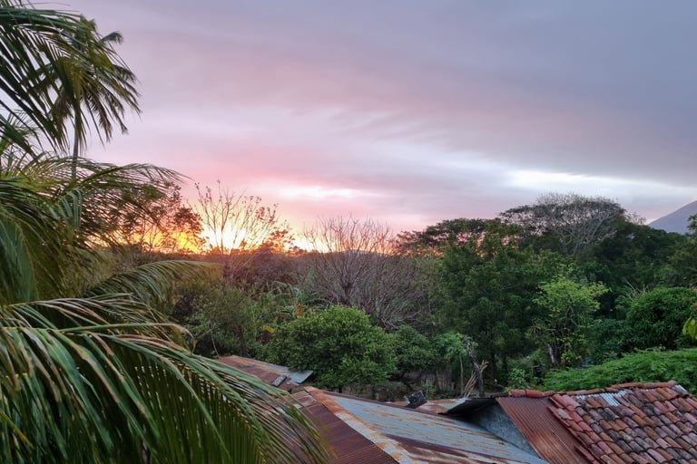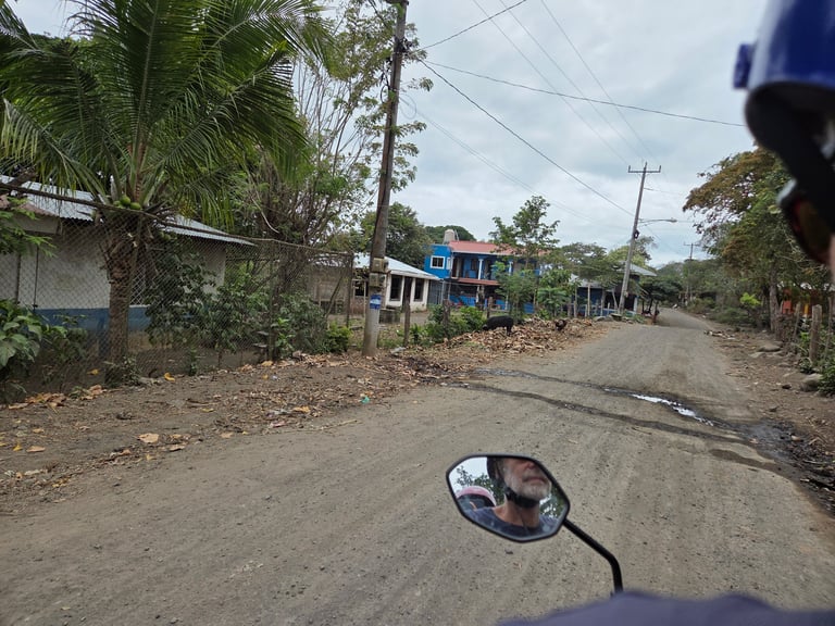 Mit Wendy und Dash aus Holland, die wir in unserem Hostel in Granada beim Frühstück kennengelernt haben, hatten wir verabredet, dass wir uns auf Ometepe ein Taxi teilen. Wendy spricht fließend spanisch, da ihre Mutter aus Peru stammt. So handelt sie mit dem Taxifahrer einen fairen Preis aus. Beide Vulkane werden jeweils von einer Straße umrundet und in der Mitte gibt es eine Verbindungsstraße zwischen den beiden Ringen. Das Verkehrsgeschehen ist überschaubar und gemütlich. Einige Autos, diverse Motorroller, ein paar Pferde und einige Kuhherden teilen sich die Straße. Für die 28 km vom Hafen zu unserer Unterkunft benötigen wir eine Stunde.