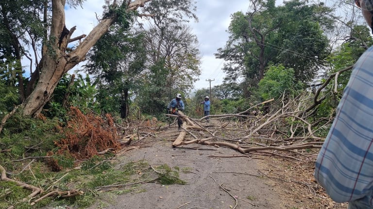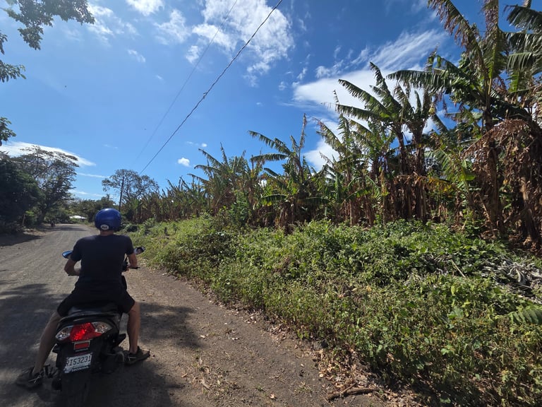 Tagsdrauf umrunden wir den östlichen Vulkan auf der Ringstraße. Hier ist wenig los. Große Teile der Strecke fahren wir auf nicht gepflasterten Straßen. Schweine, Hunde, Pferde, Ziegen und Kühe teilen sich die Straße mit uns. Kinder grüßen uns und dann liegen plötzlich Baumstämme und Äste quer über den Weg. Ein Arbeitstrupp hat gerade zahlreiche Äste gekappt und auch einige Bäume gefällt, die der Stromleitung zu nahe gekommen sind. Mit seiner Machete schlägt ein Arbeiter uns und einem weiteren Motorradfahrer den Weg frei. Da der Vulkanboden sehr fruchtbar ist, säumen zahlreiche Bananenplantagen unseren Weg. Wir gönnen uns zwei Zwischenstopps am See und sind froh, dabei nicht auf eine Partymeile zu treffen.