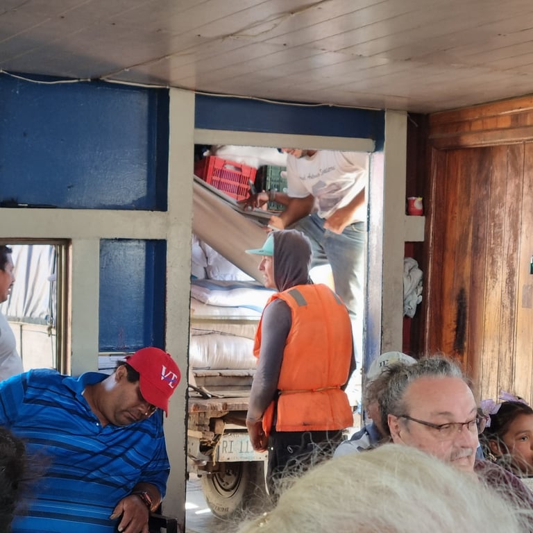 Im Hafen von San Jorge entern wir eine alte, kleine Fähre. Zwei Kleinlaster und ein Auto werden mit Holzkeilen unter den Reifen und dicken Bändern um die Räder fixiert. Davor ist der kleine Fahrgastraum. Die Heckklappe bleibt heruntergelassen und bei 5 bis 6 Windstärken mit seitlichen Wellen geht es in 70 Minuten über den See. Einigen Fahrgästen bekommt das Geschaukel nicht so gut und auch, wenn das Schiff keinen vertrauenserweckenden Eindruck hinterlässt, geben wir uns mal wieder dem Prinzip „Zuversicht“ hin. Schließlich verkehrt das Gefährt seit Jahrzehnten täglich mehrfach zwischen Insel und Festland.
