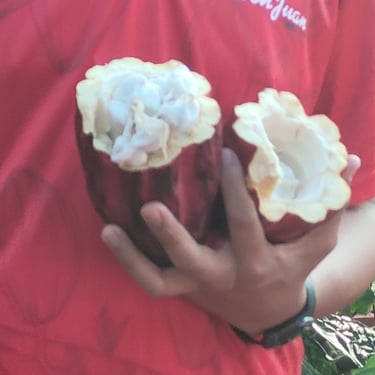 Auch lernen wir den Herstellungsprozess von Kakao kennen. Unser Guide bricht ein Kakaofrucht auf und wir dürfen das weiße Fruchtfleisch probieren. Es sieht wie Litschi aus und schmeckt ein wenig nach Mango. Der Kakaokern ist lila farbend. Die Bohnen werden dann in einem Behälter fermentiert, damit das weiße Fruchtfleisch zersetzt wird. Während dieses Prozesses riecht die Masse säuerlich und unangenehm. Unvorstellbar, dass dieses die Grundlage für alle leckeren Schokoladen dieser Welt bildet. Doch am Ende der Fermentation ist säuerliche Duft verschwunden und die Masse getrocknet. Die Masse wird noch in kleine Stücke (Nibs) gebrochen und kann dann zu Schokolade verarbeitet werden.