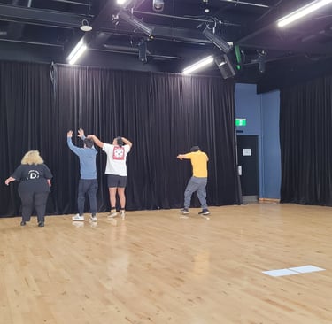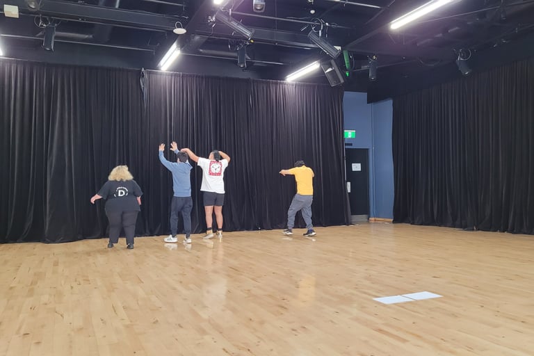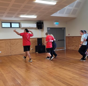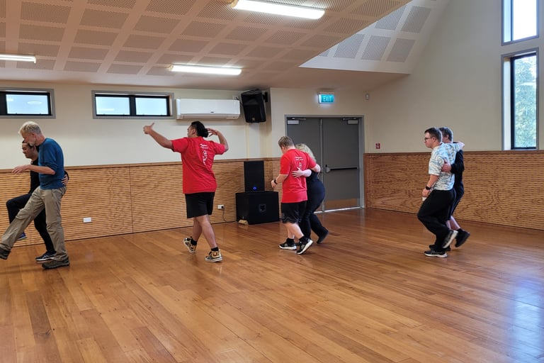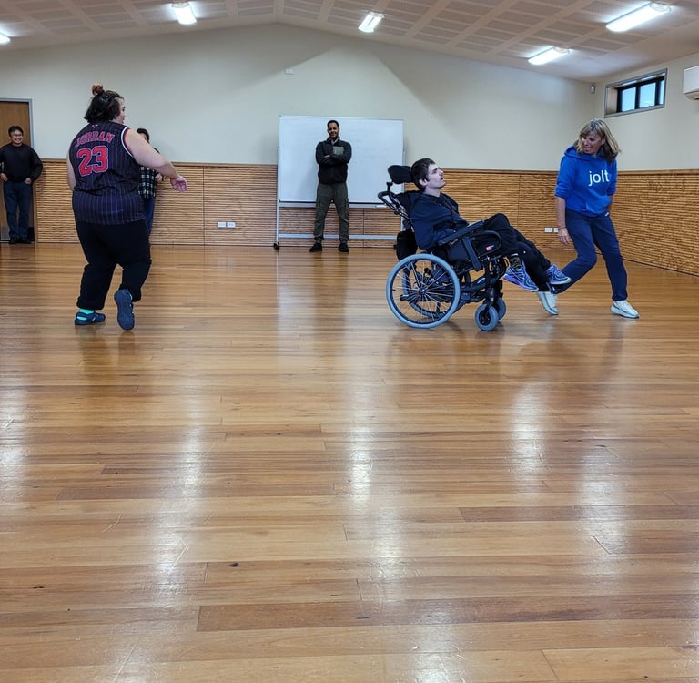 Tagsdrauf treffen sich acht Tanzlehrerinnen und -lehrer von Jolt für drei Stunden im Gemeindezentrum. Es wird gemeinsam mit Lyn und Kate reflektiert, wie die Tanzstunden der letzten Woche verlaufen sind und weitere Stunden werden geplant. Als erste entwickelt Roshal Elemente für ihre nächste Gruppenstunde und probt diese mit uns und den anderen Lehrern. Joe hat währenddessen die Aufgabe sich zwanzig Minuten in einem Nebenraum zurück zu ziehen und seine nächste Stunde zu planen. Als er fertig ist, wird seine Planung an einer Tafel visualisiert und er probiert die Stunde mit uns allen umzusetzen. Dabei coachen Lyn und Kate ihn und geben Hinweise. Drei Stunden später setzt Joe seine Idee in Realität um. Es kommt eine bunte Gruppe von Menschen mit höheren Assistenzbedarf und unterschiedlichen Altersstufen zusammen.